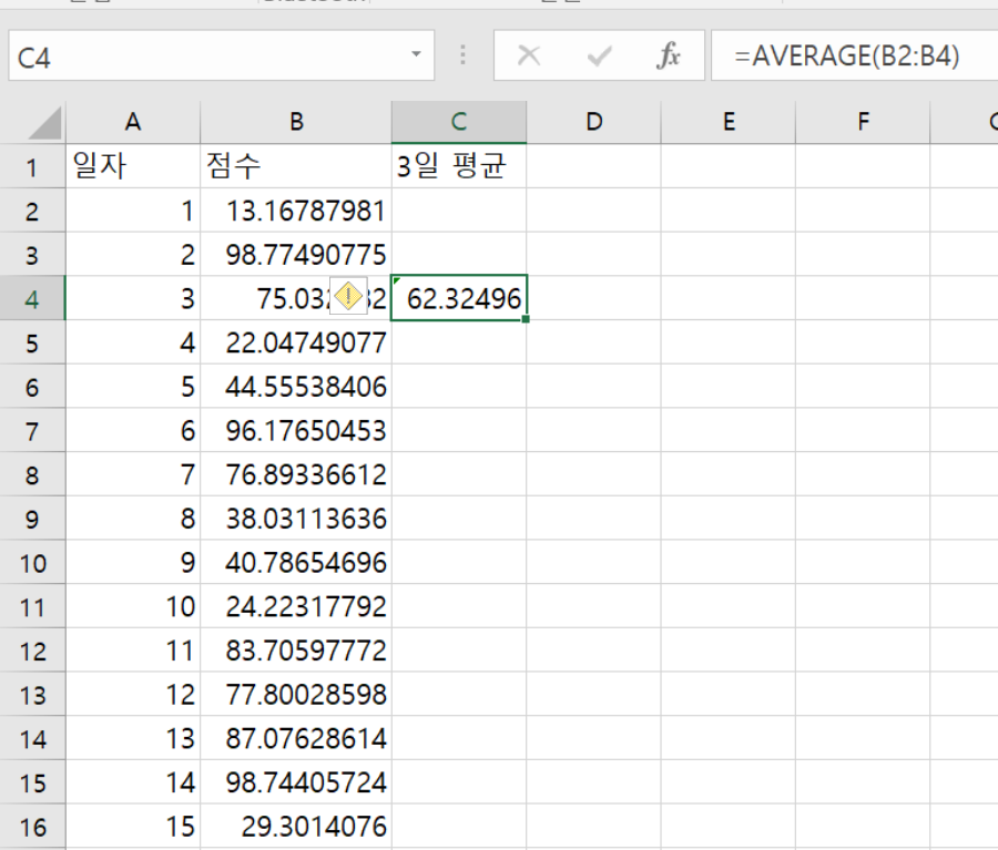 셀C4에는 B2:B4의 3일 간의 점수에 대한 평균이 들어간다.