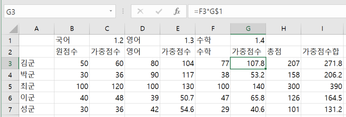 또한 이 값을 영어의 가중점수인 셀 E3에 복사하면, E3*E$1이 적용될 것이다.