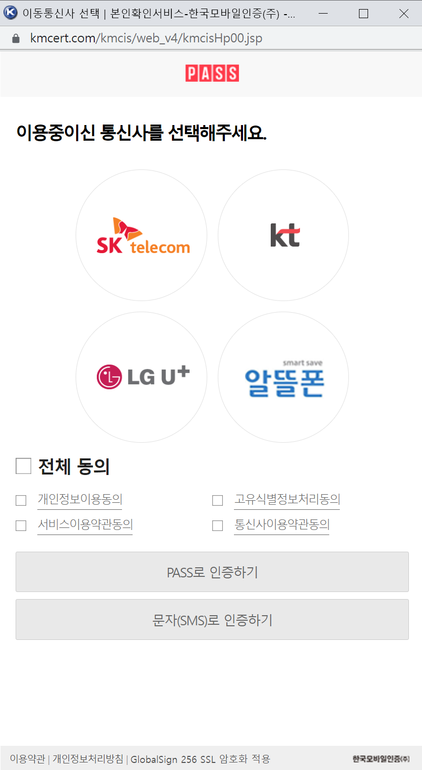 PASS 또는 문자로 인증을 진행하여 가입을 완료합니다.