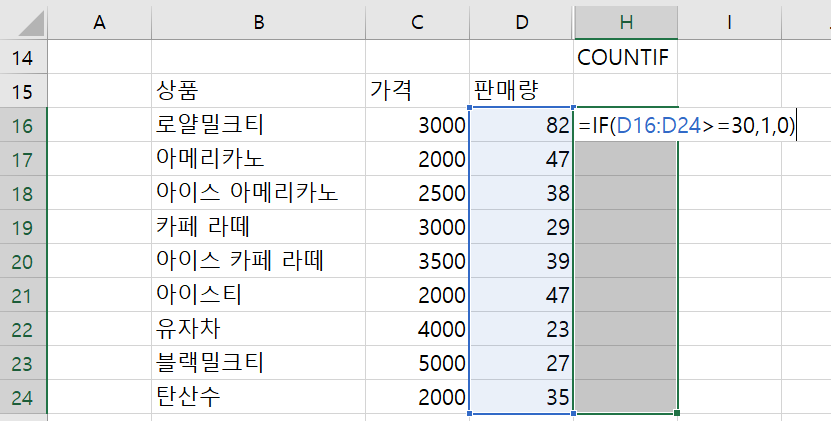 판매량이 30 이상인 상품의 수를 구하는 수식을 만들어 보자.