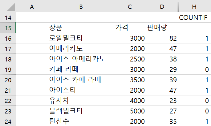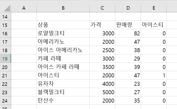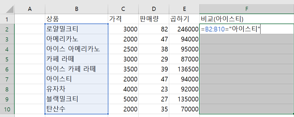 =B2:B10="아이스티"