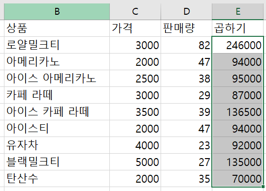 가격과 판매량을 곱한 값을 E열에 표기해보자.