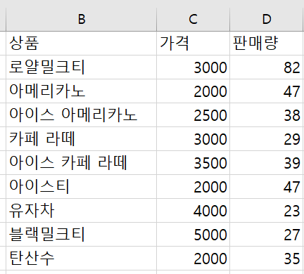상대적으로 같은 위치에 있는 가격값과 판매량값이 곱해진 결과가 상대적으로 같은 위치에 있는 셀에 저장된다.