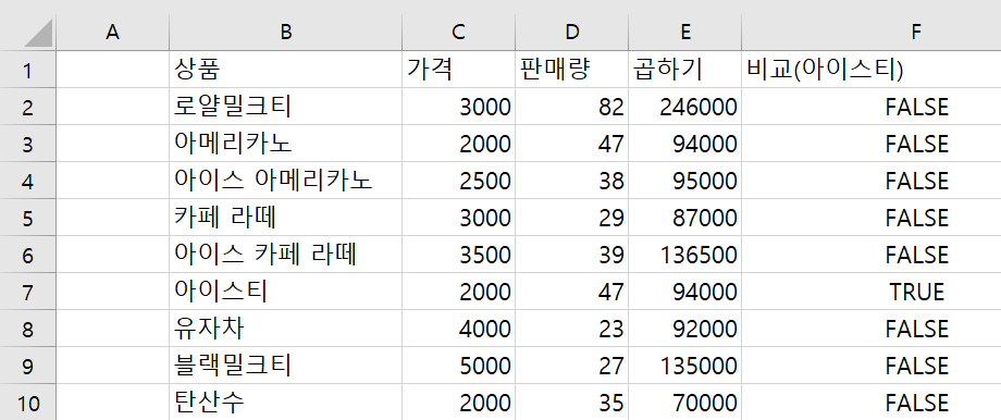 03. 배열 논리 연산과 IF함수위의 데이터에서 상품명이 아이스티인 경우 True를 반환하는 비교연산을 수행해보자.