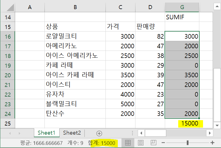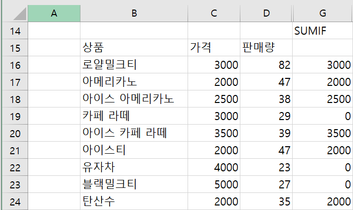 이런 결과를 이용하여 SUMIF와 같은 효과를 내는 수식을 만들어보자.