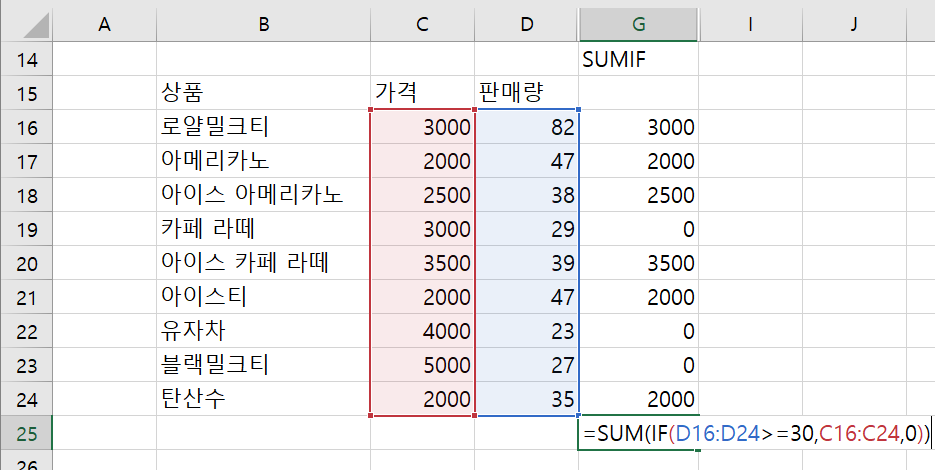 판매량이 30 이상인 상품의 가격의 총합을 구하는 수식을 만들어 보자.