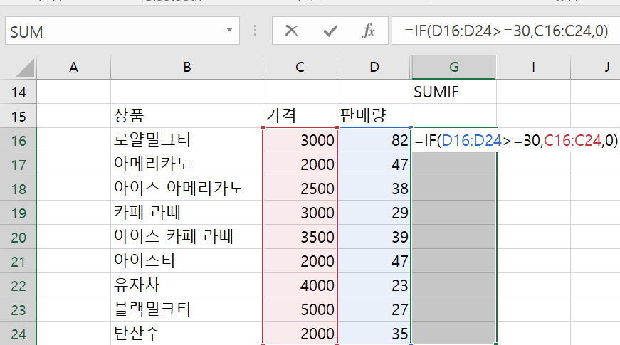 이해를 돕기 위해 IF문을 이용하여, 판매량이 30이상일 경우, 가격을 표기하고, 30미만인 경우 0을 표기하는 수식을 만들어보자.