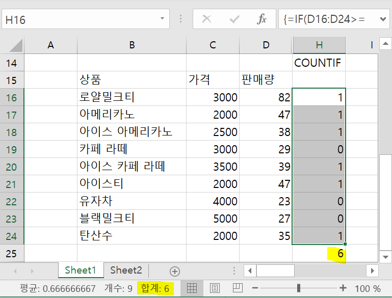SUM함수로 위의 IF문을 감싸준 후에, Ctrl + Shift + Enter를 입력하면 COUNTIF와 같은 효과를 낼 수 있다.