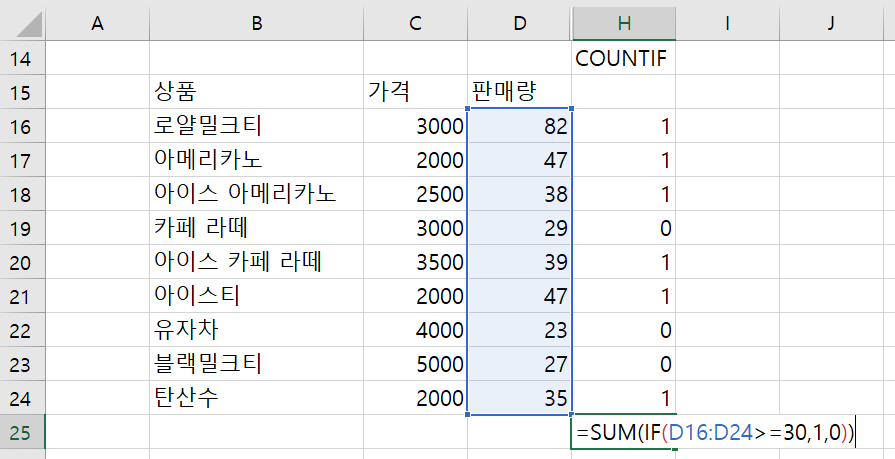 판매량이 30 이상인 상품의 수를 구하는 수식을 만들어 보자.