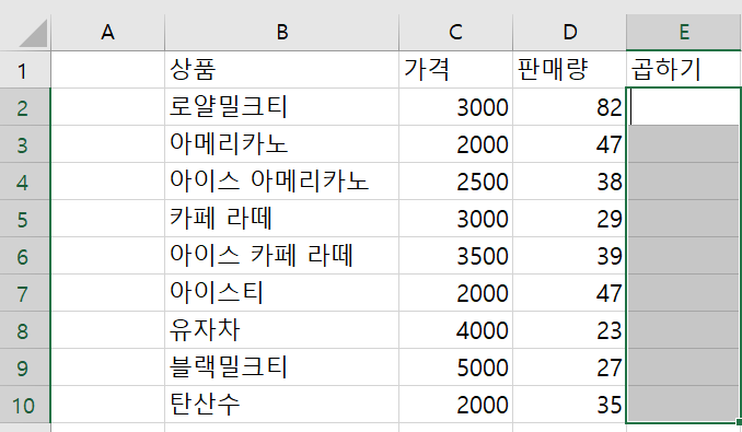 가격과 판매량을 곱한 값을 E열에 표기해보자.