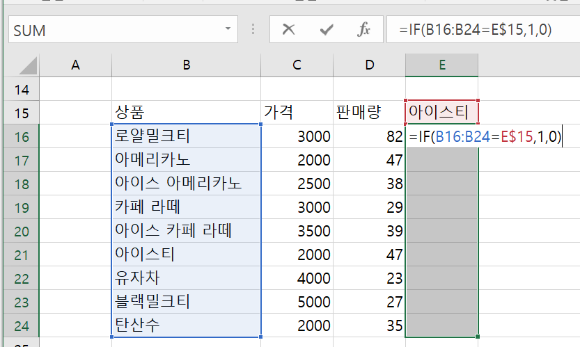 =B2:B10="아이스티"