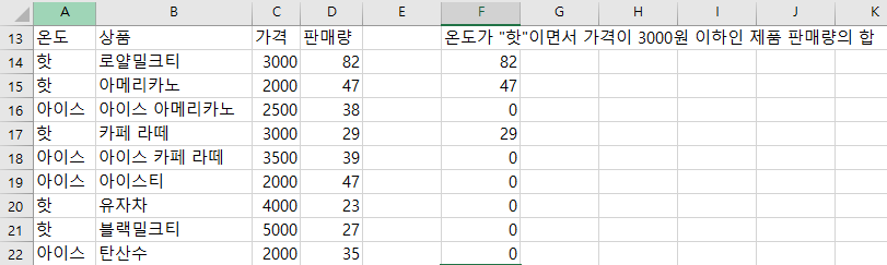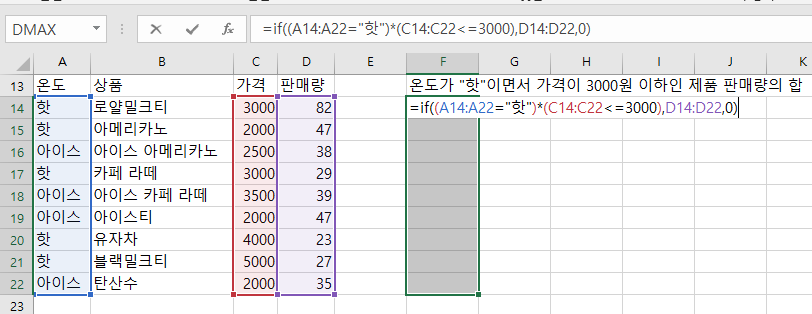 =if((A14:A22="핫")*(C14:C22<=3000),D14:D22,0)