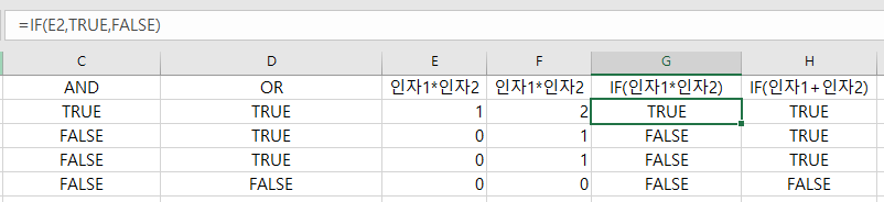 IF함수의 조건부분에 숫자를 넣었을 때의 논리 결과는 위의 그림에서 확인할 수 있다.