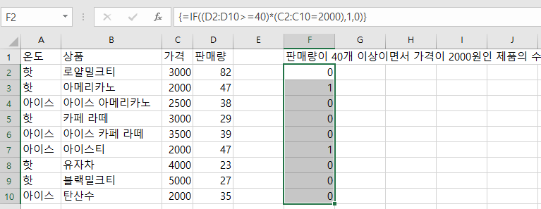두가지 조건을 괄호로 묶고 곱해준다. 두 조건의 곱이 참인경우 판매량 정보를 가져오고, 아닌경우 0을 가져오게 한다.