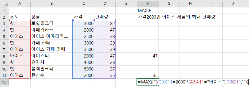 =MAX(IF((C3:C11=2000)*(A3:A11="아이스"),D3:D11,""))