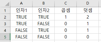 - 인자1 인자2의 덧셈의 논리값 = 인자1 OR 인자2다음과 같은 예제를 통해 확인해보자.