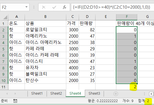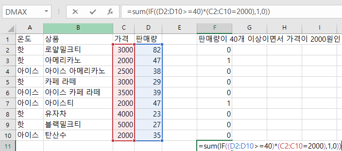 두가지 조건을 괄호로 묶고 곱해준다. 두 조건의 곱이 참인경우 판매량 정보를 가져오고, 아닌경우 0을 가져오게 한다.