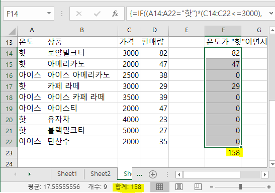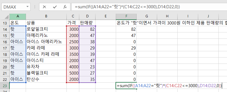 =sum(IF((A14:A22="핫")*(C14:C22<=3000),D14:D22,0))