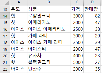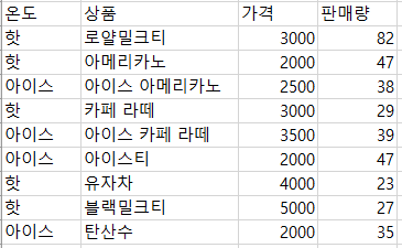 위의 데이터가 있을 때, 온도가 "핫" 이면서 가격이 3000원 이하인 제품 판매량의 합을 구해보자.