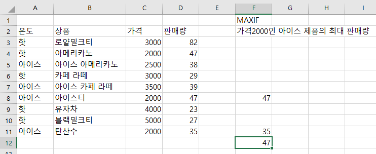 위의 데이터에서 가격이 2000원인 아이스 제품의 최대 판매량을 구해보자.