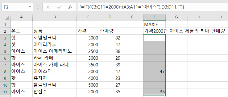 =MAX(IF((C3:C11=2000)*(A3:A11="아이스"),D3:D11,""))