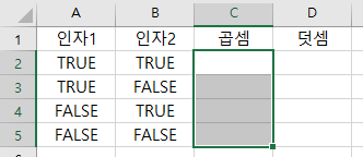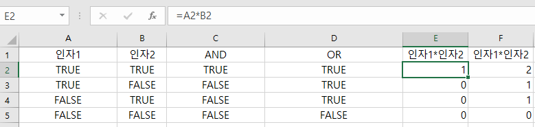 - 인자1 인자2의 곱셈의 논리값 = 인자1 AND 인자2