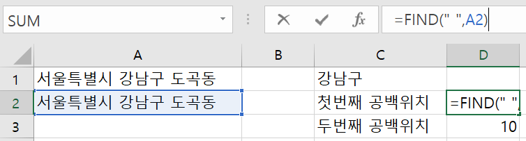 문자열의 첫번째 공백의 위치를 구하는 수식은 다음과 같다.