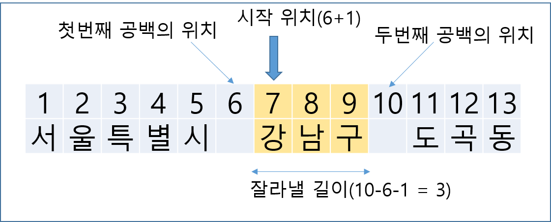 위의 그림처럼, 첫번째 공백의 위치에서 1을 더하면 잘라낸 문자열의 시작위치가 나온다. 두번째 공백위치에서 첫번째 공백위치를 빼고 추가로 1을 더 빼면 잘라낼 길이가 나온다.
