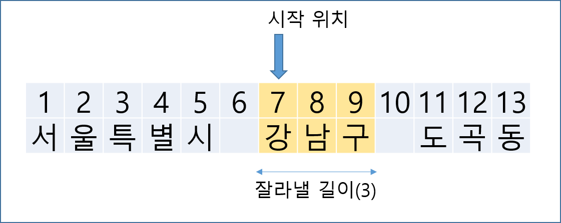 위의 예제에서는 길이가 13인 문자열 중에서, 7번째 위치에서 3개의 길이만큼을 잘라내어, "강남구"만 반환되는 것을 확인할 수 있다.