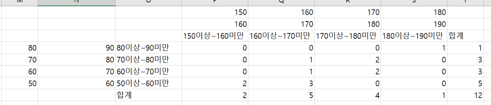 01. 문제다음 키와 체중자료로 각각 도수분포표의 빈 칸을 작성하시오. 키와 체중의 상관표를 작성하시오.