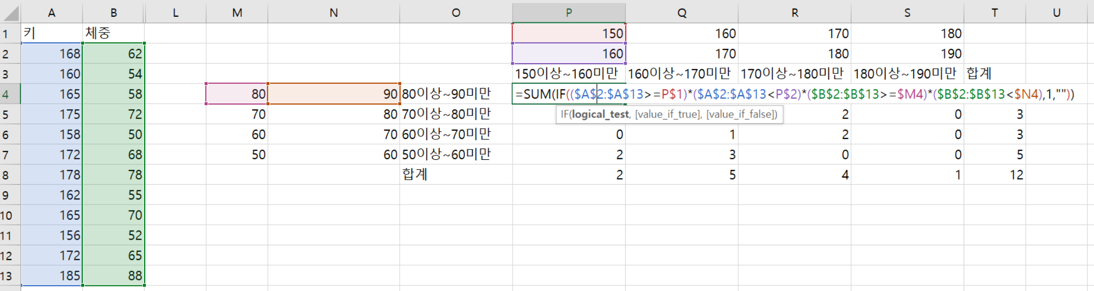 IF문이 반환하는 배열을 SUM함수로 넣으면 키와 체중 조건을 만족하는 데이터의 수를 구할 수 있다.