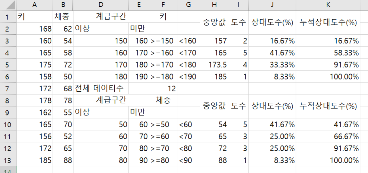 12가 들어 있는 셀을 절대주소로 참조한 이유는 밑에 있는 3가지 계급구간에도 해당값을 복사하기 위해서이다.