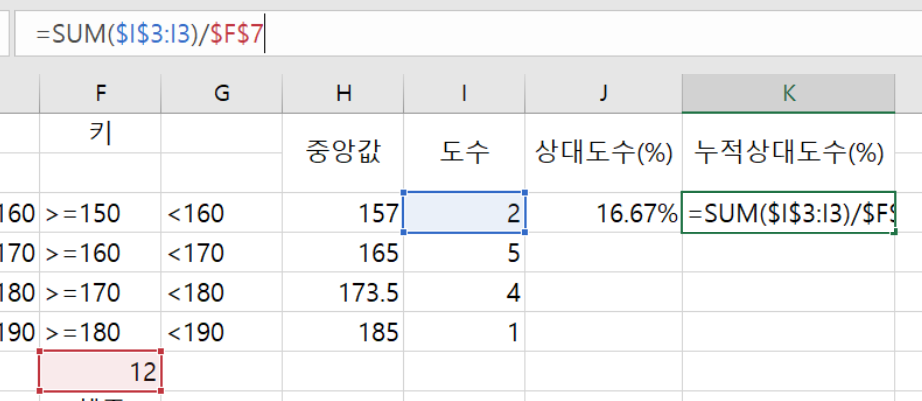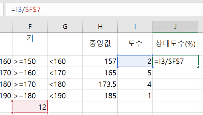 12가 들어 있는 셀을 절대주소로 참조한 이유는 밑에 있는 3가지 계급구간에도 해당값을 복사하기 위해서이다.
