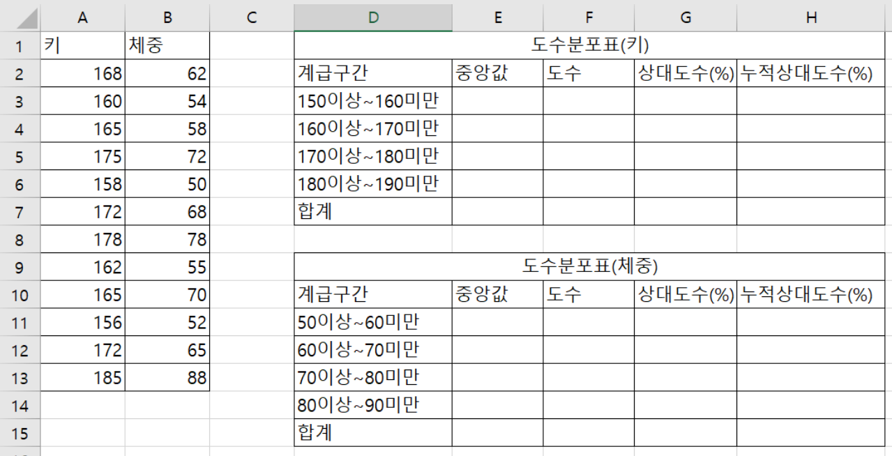 01. 문제다음 키와 체중자료로 각각 도수분포표의 빈 칸을 작성하시오. 키와 체중의 상관표를 작성하시오.