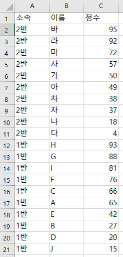 위와 같은 데이터가 있을 때 1반과 2반의 점수의 총합을 각각 구해야 한다고 생각해보자.