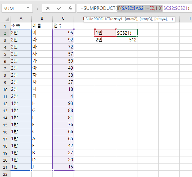 이 배열과, 점수가 입력되어 있는 C열의 SUMPRODUCT함수의 인자로 넣어보자.