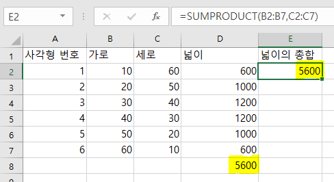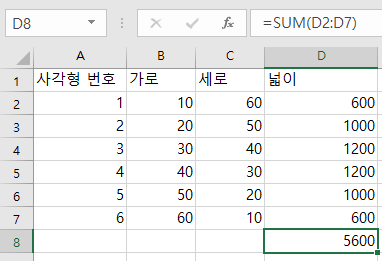 SUM 함수를 D열에 적용하면 넓의의 총합을 구 할 수 있다.