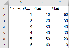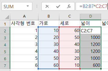 위의 수식은 배열 수식으로 사각형의 넓이를 D열에 표기한 결과이다.