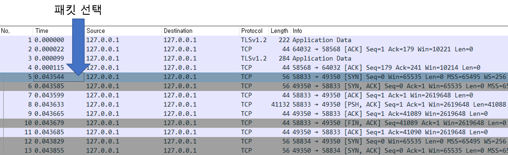 - 특정 시퀀스의 패킷을 마우스로 클릭한다.