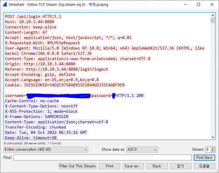이후 상술한 방식으로 Follow TCP Stream을 실행한다