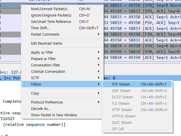 - 또는 마우스 우클릭 후 Follow > TCP Stream 선택