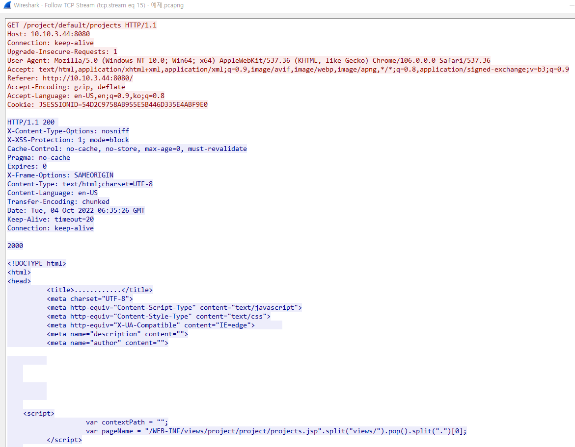- TCP Stream 메뉴를 클릭하면, 새로운 창이 뜨면서 TCP Stream이 표기된다.