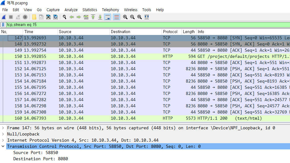 tcp.stream에 할당되는 번호는 캡쳐된 패킷 중에서 몇 번째로 발생된 스트림인지를 나타낸다.