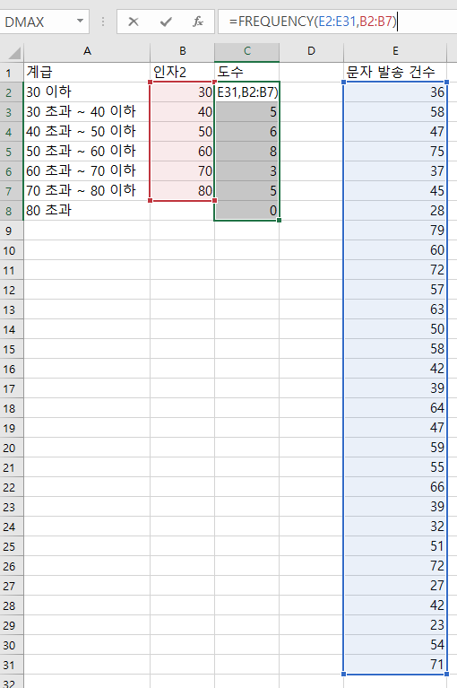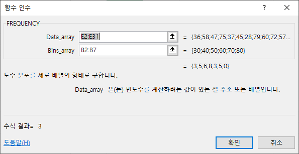 인자2(Bins_array)는 30, 40, 50, 60, 70, 80이 들어가 있으며, 각각의 값이 의미하는 것은 A열에 있는 내용과 같다.