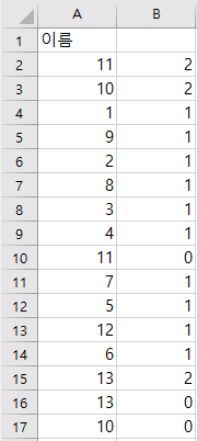 가장 첫번째 행에 있는 11의 경우 A열에 2개가 존재한다. 처음 나오는 11의 값은 2가되고, 두번째 나오는 11의 값은 0이 된다. 1같은 경우는 A열에 1개가 있기 때문에 1이 출력된다.