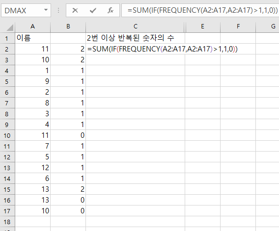 IF함수와 SUM을 함께 사용하여 2번 이상 반복된 숫자의 수를 구할 수 있다.