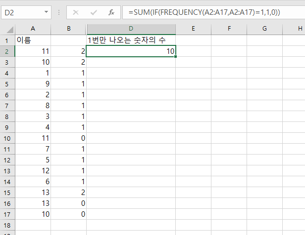 IF함수와 SUM을 함께 사용하여 1번만 등장한 숫자의 수를 구할 수도 있다.