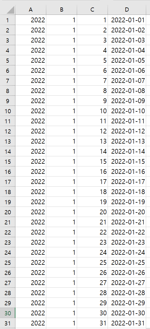 2022년 1월의 모든 날짜가 생성되는 것을 확인할 수 있다.