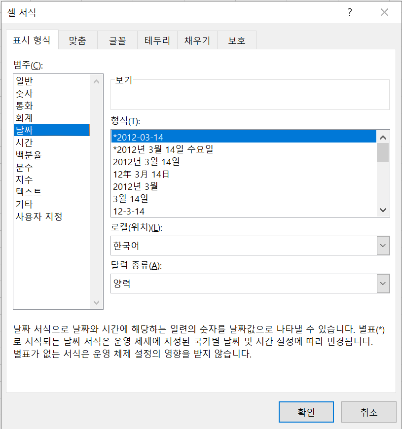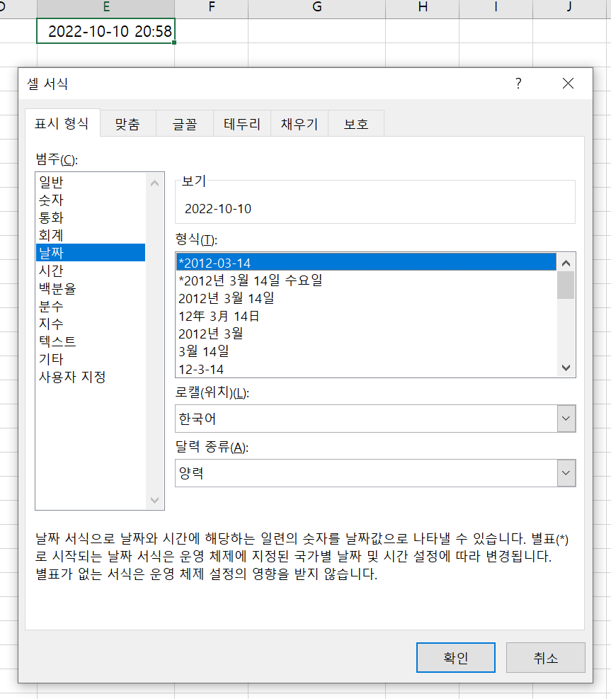 셀 서식의 표시 형식에서 날짜 부분을 보면 여러 형식이 있는데, 이 중에서 일부 형식은 입력 시에 자동으로 날짜로 분류된다.