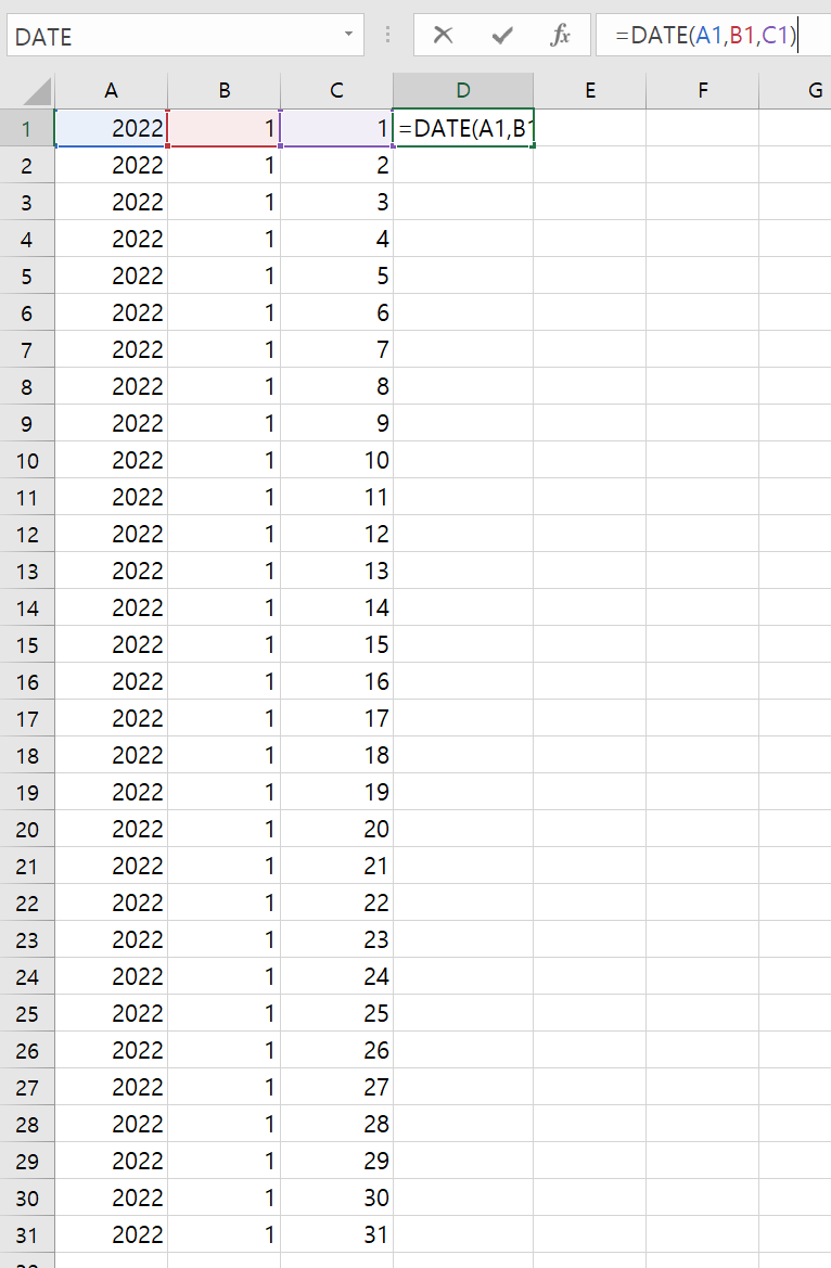03. Date 함수날짜를 입력하기위해서는 엑셀에서 자동으로 입력한 값을 날짜로 인식시키는 방법도 있지만, Date 함수를 이용하여 사용자가 원하는 날짜를 제작하는 방법도 있다.